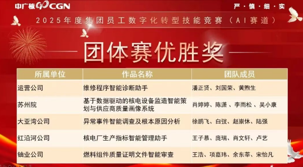 數字化轉型賽道上,由計劃部龐瑞、王子慕、肖文軒、信息文檔部盧藝聯合申報的“核電廠生產指標智能管理助手”作品,在中廣核數字化轉型技能競賽中摘得團體優勝獎;盧藝榮獲個人優勝獎。