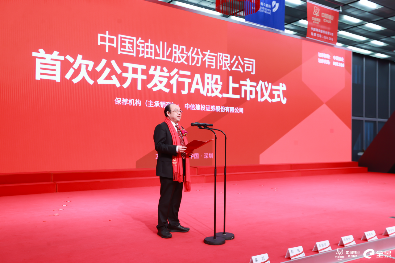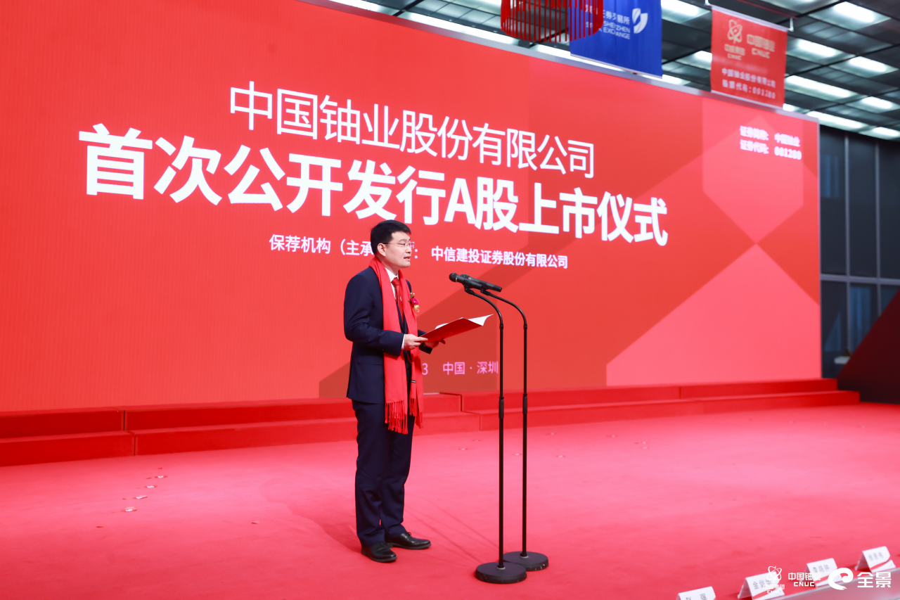 上市儀式現場,中核集團總經理、黨組副書記張濤,國家原子能機構系統工程司副司長王進軍,中核集團黨組成員、總會計師王學軍,中核集團黨組成員、副總經理陳軍利,國家產業基金董事長曲克波,中國國新控股有限責任公司黨委書記、董事長徐思偉,中信建投證券股份有限公司黨委副書記、總經理金劍華,中國鈾業黨委書記、董事長袁旭一同為中國鈾業敲鐘開市。中國礦業聯合會黨委書記、會長程利偉,中國核能行業協會常務副理事長曹述棟,深圳證券交易所黨委委員、副總經理李鳴鐘,保薦人(主承銷商)團隊、股東與公司管理層代表、中介機構代表以及媒體記者等共同見證了這一時刻。