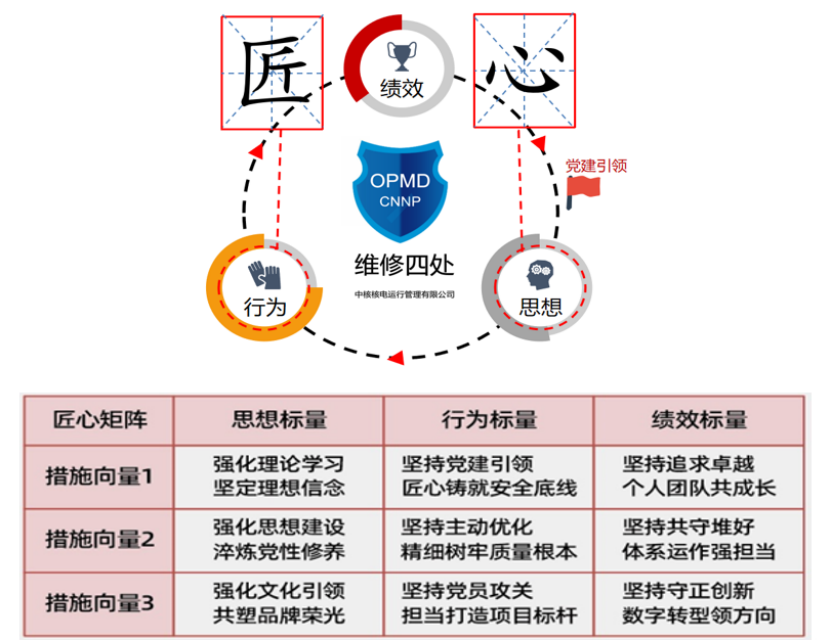 秦山核電維修四處長期致力于部門核安全文化建設,通過“三個強化、六個堅持”系列舉措,實現黨建工作與核安全文化建設的有機融合。處室積極落實中核集團核安全文化“863”動作要領,致力于構建以黨建為引領、以核安全文化為基礎的維修安全體系,創建了“思想、行為、績效”黨建模型,倡導并踐行“思想引領行為、行為創造績效、績效提升思想”的良性循環。基于秦山核電公司“責任、安全、創新、協同”的核心價值觀,部門凝練出“匠心、擔當、卓越、成長”為核心的價值追求和“三個強化、六個堅持”匠心矩陣具體舉措,將核安全文化建設原則和要素有效融入其中,有力推動核安全文化在組織與員工層面的落地。