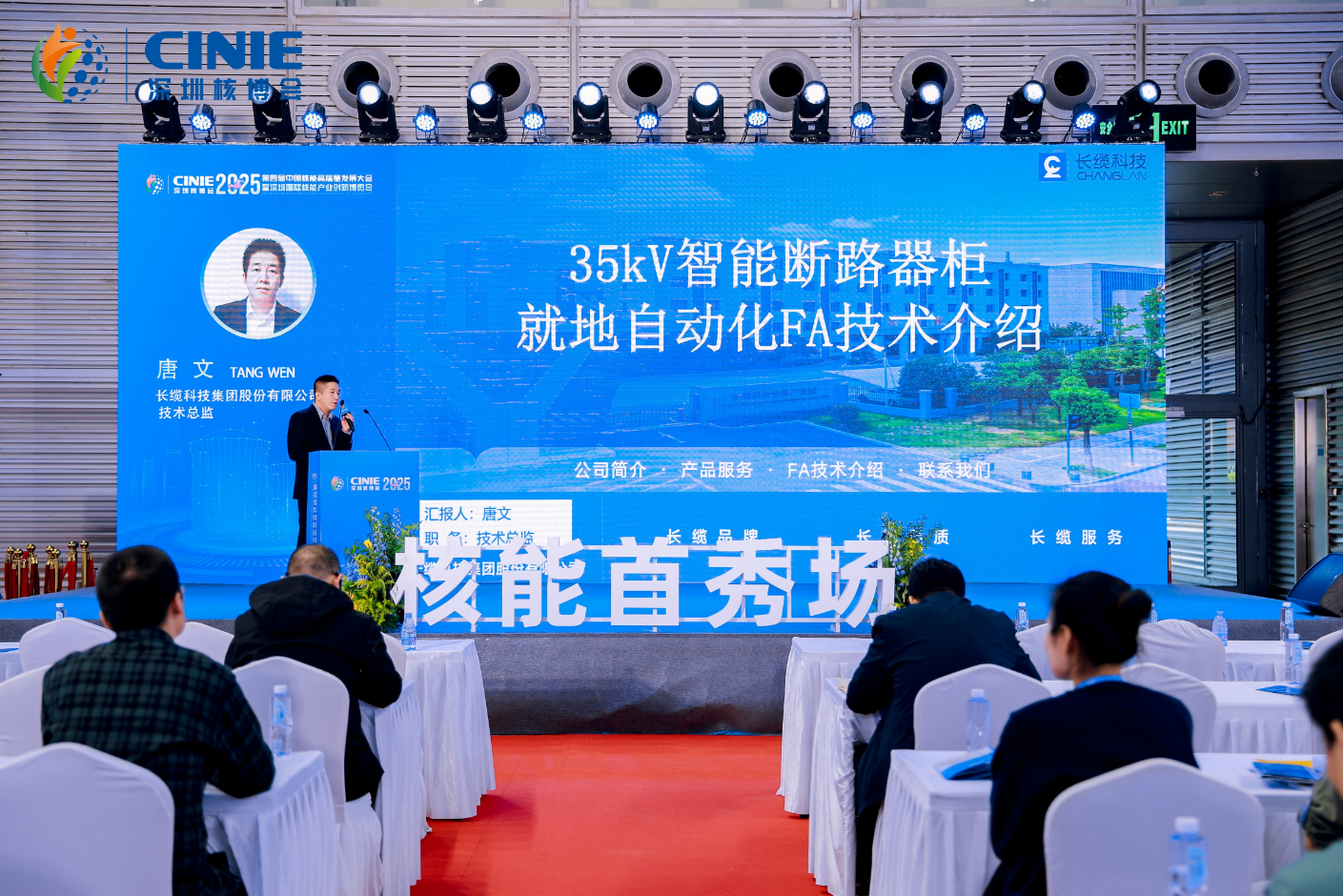 本屆核博會(huì)特設(shè)“核能首秀場”活動(dòng),為核能行業(yè)新成果、新技術(shù)提供展示平臺(tái)。長纜科技電氣子公司發(fā)表“35kV 智能斷路器柜就地自動(dòng)化 FA 技術(shù)”的專題演講,圍繞技術(shù)原理、核心優(yōu)勢(shì)、應(yīng)用場景及實(shí)踐成效展開深入分享。該項(xiàng)技術(shù)能有效強(qiáng)化新能源電力系統(tǒng)及電力網(wǎng)絡(luò)的供電穩(wěn)定性,提升運(yùn)維效率。
