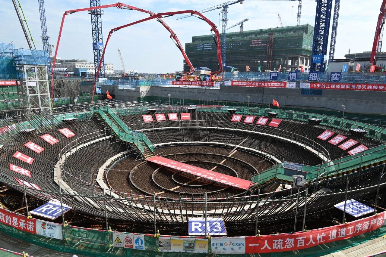 2號核島基礎(chǔ)長約89.1米、最寬處49.1米,預(yù)計澆筑混凝土總量6635.5立方米,為難度較高的大體積混凝土澆筑。作為項目總承包方,上海核工院基于“向技術(shù)要一切”的創(chuàng)新理念,在前序項目和1號機組的基礎(chǔ)上持續(xù)開展施工優(yōu)化:首次實現(xiàn)核島底板周邊全范圍“逆作法”施工,降低外墻鋼筋密集區(qū)振搗難度;實現(xiàn)插筋全范圍落底,化解澆筑階段的偏位風(fēng)險;對梯籠及腳手架通道布置進(jìn)行優(yōu)化,能夠有效提升澆筑效能,保障澆筑質(zhì)量。
