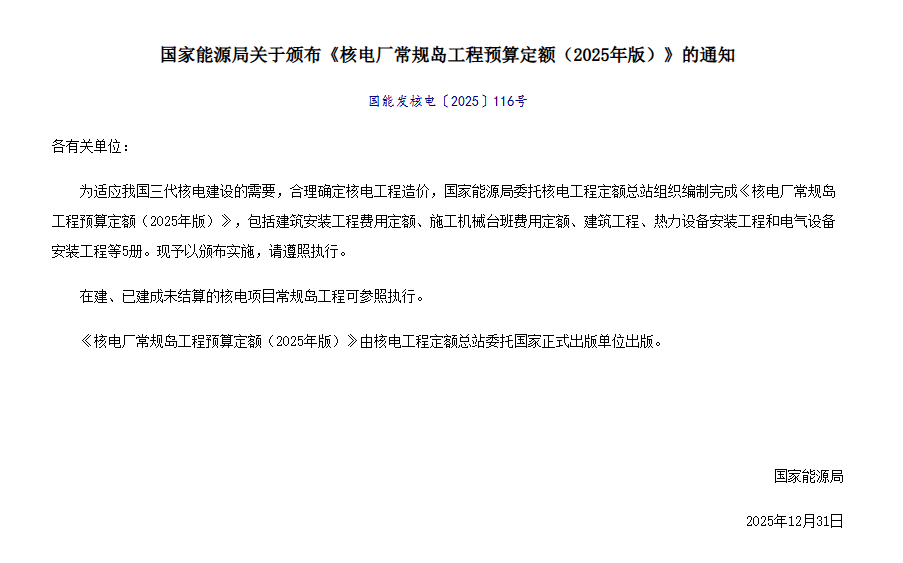 1月14日,國家能源局發布通知,為適應我國三代核電建設的需要,合理確定核電工程造價,國家能源局委托核電工程定額總站組織編制完成《核電廠常規島工程預算定額(2025年版)》并頒布實施,包括建筑安裝工程費用定額、施工機械臺班費用定額、建筑工程、熱力設備安裝工程和電氣設備安裝工程等5冊。在建、已建成未結算的核電項目常規島工程可參照執行。