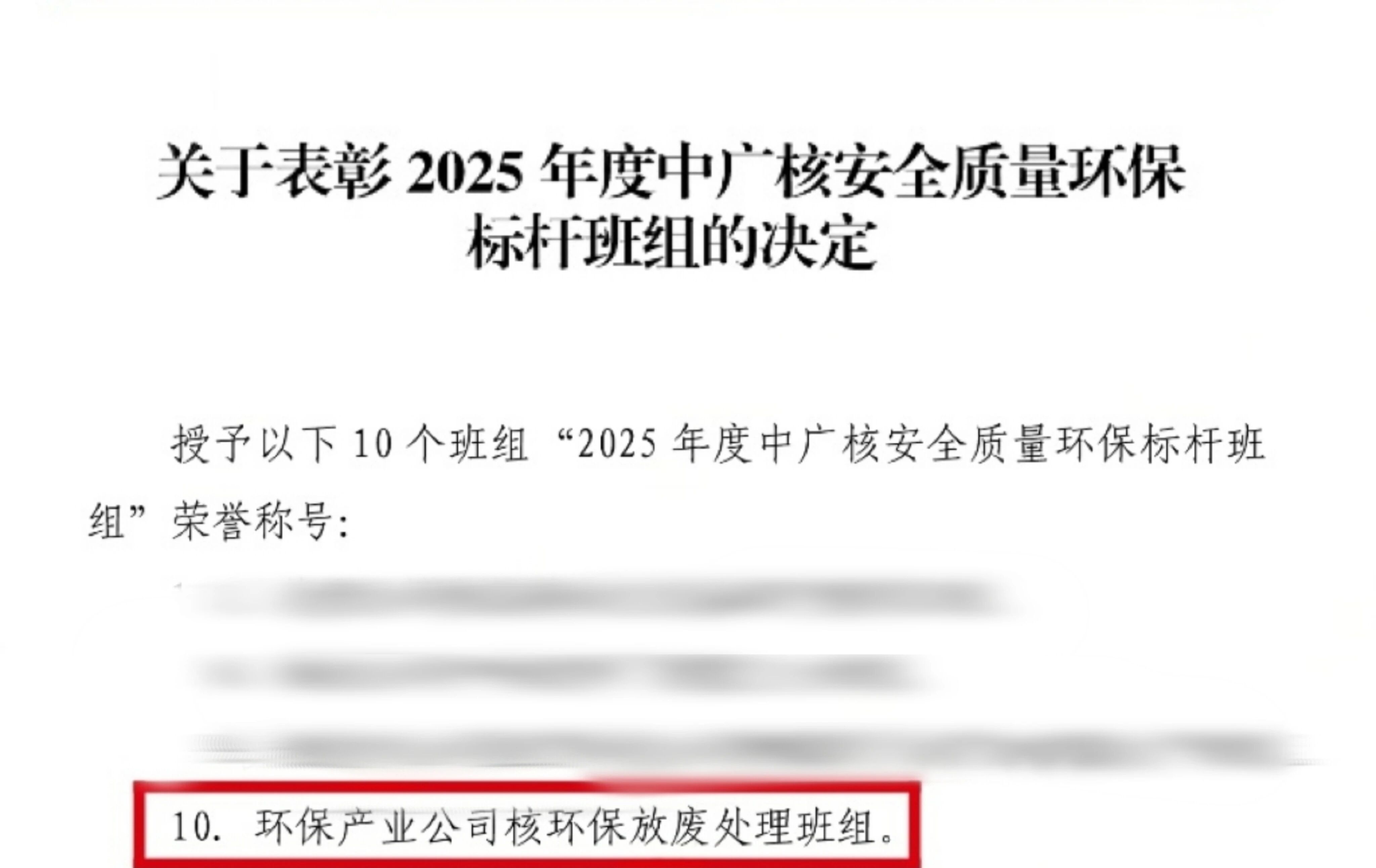 “公司核環(huán)保放廢處理班組”獲評安全質量環(huán)保標桿班組