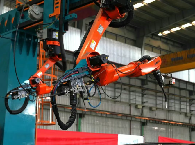 在硬件方面,該工作站通過九軸懸臂焊接機器人與對稱雙機布局,結合柔性工裝自適應技術,實現了三大核心突破:一是高效并行作業——雙機器人同步覆蓋大型曲面工件的多區域,顯著提升焊接效率;二是柔性適配能力強——滿足多品種、非標薄壁構件的快速切換;三是在滿足復雜結構焊接需求的同時,縮短生產周期并最大化設備利用率。