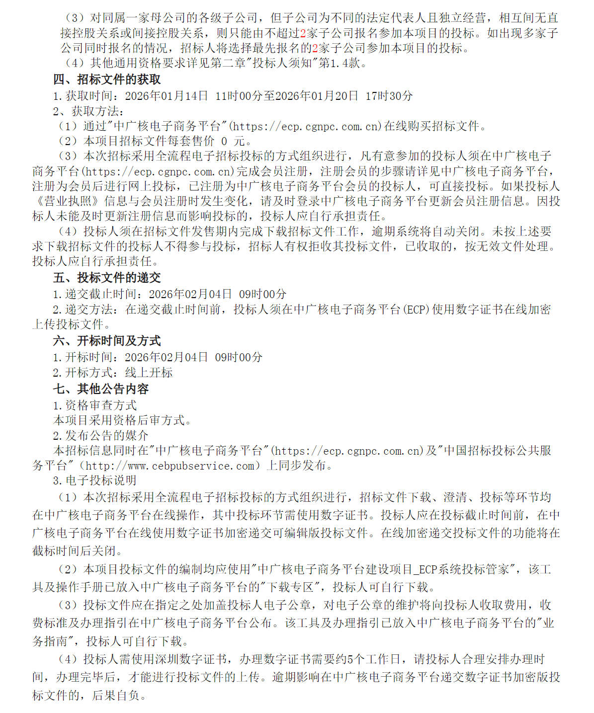 招標內容與范圍:寧德核電廠5、6機組施工期海域環境跟蹤監測和傾倒區跟蹤監測項目(2026~2029年),采購范圍包括施工海域海洋生態跟蹤監測、地形地貌定期監測及沖淤變化分析、海洋環境質量現狀監測及生態跟蹤監測評價,傾倒區跟蹤監測等。本次采購擬采用公開招標、資格后審方式進行
