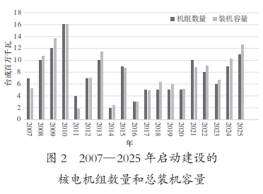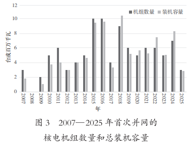 2025年全球共有3臺(tái)核電機(jī)組實(shí)現(xiàn)首次并網(wǎng)發(fā)電,印度、中國和俄羅斯各1臺(tái),包括2座壓水堆和1座加壓重水堆。