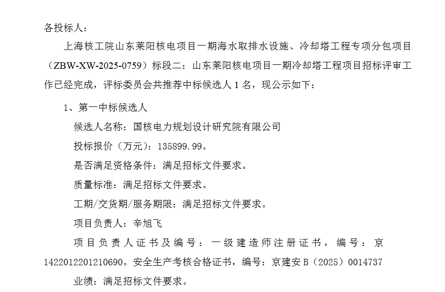第一中標候選人為國核電力規劃設計研究院有限公司,投標報價為135,899.99萬元。該公司滿足招標文件所規定的全部資格條件、質量標準及工期要求。