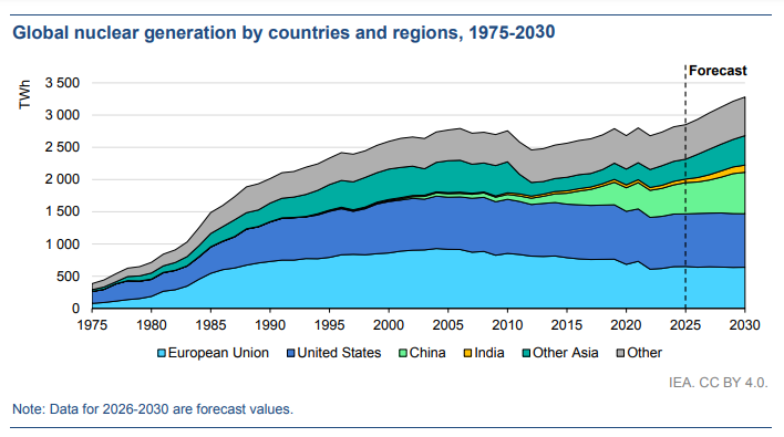 預計到2030年,中國的核電發(fā)電量將平均每年增長近6%,而美國和歐盟的核電發(fā)電量將保持基本穩(wěn)定。因此,預計中國在全球核電中所占份額將從2025年的17%上升到2030年的20%,而美國的份額將從29%下降到25%,歐盟的份額將從23%下降到20%。盡管這些份額有所下降,但增加核電發(fā)電量仍然是一項重大舉措。