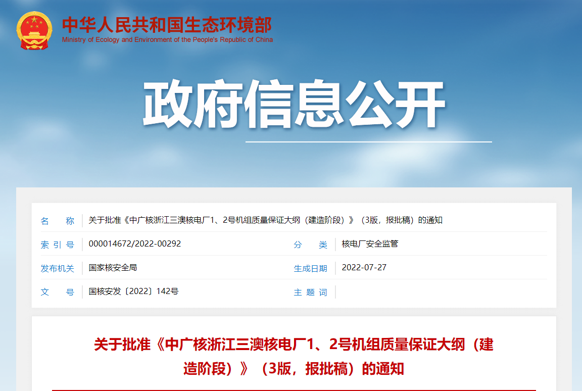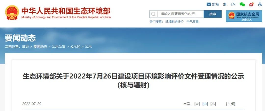 7月29日,生態環境部發布關于2022年7月26日建設項目環境影響評價文件受理情況的公示(核與輻射),將國和一號示范工程1、2號機組環境影響報告書(運行階段)受理情況予以公示,公示期為2022年7月29日-2022年8月11日(10個工作日)。
