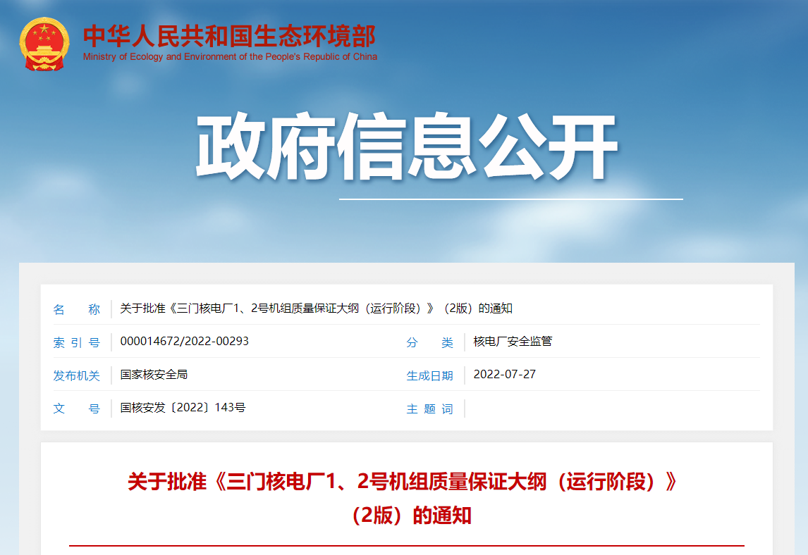 關于批準《三門核電廠1、2號機組質量保證大綱(運行階段)》(2版)的通知