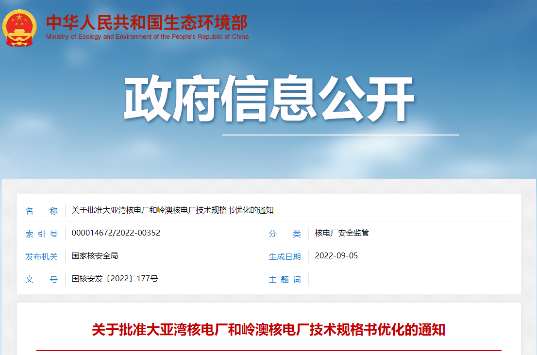 關于批準大亞灣核電廠和嶺澳核電廠技術規格書優化的通知