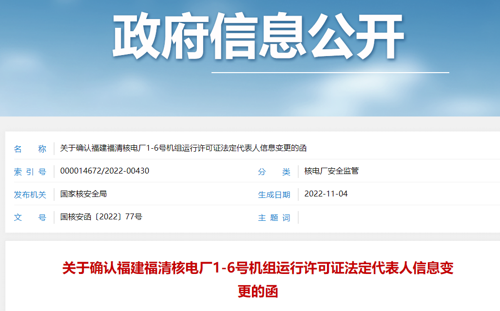 關于確認福建福清核電廠1-6號機組運行許可證法定代表人信息變更的函