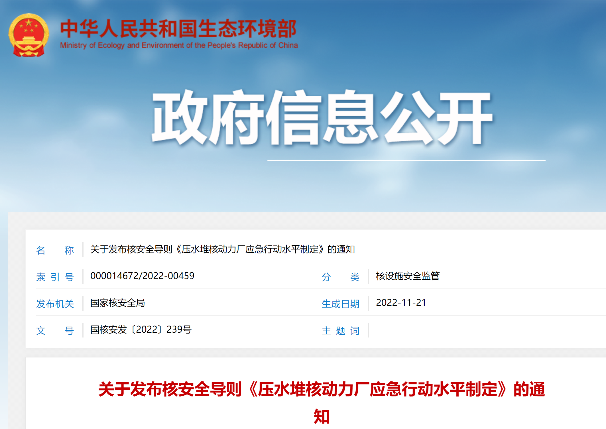 關于發布核安全導則《壓水堆核動力廠應急行動水平制定》的通知