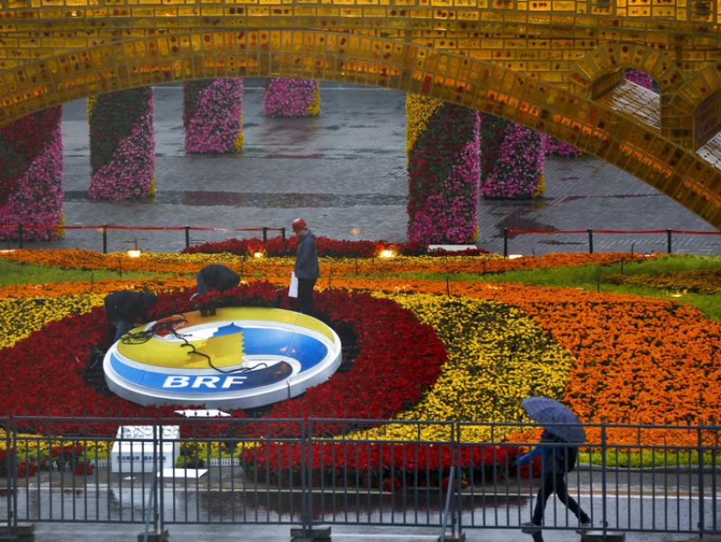 中國國家主席習(xí)近平在北京主持的一帶一路論壇圓桌會議上,工人們拆除了媒體中心外“絲綢之路金橋”結(jié)構(gòu)旁邊的“一帶一路”論壇標志, 2019.