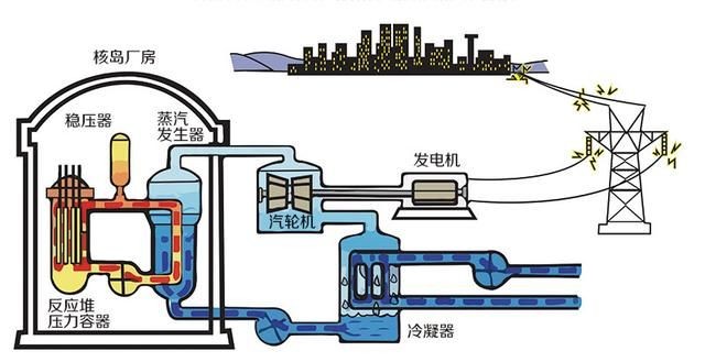 核能發(fā)電是用鈾制成的核燃料在“反應(yīng)堆”的設(shè)備內(nèi)發(fā)生裂變而產(chǎn)生大量熱能,再用處于高壓力下的水把熱能帶出,在蒸汽發(fā)生器內(nèi)產(chǎn)生蒸汽,蒸汽推動汽輪機(jī)帶動發(fā)電機(jī)一起旋轉(zhuǎn)而發(fā)電,并通過電網(wǎng)輸送給消費(fèi)者。