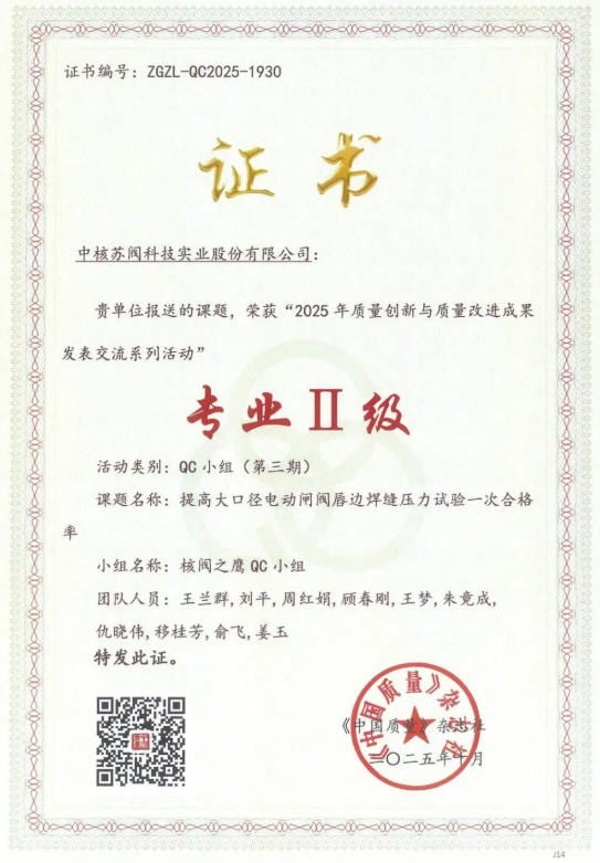 中核科技“核閥之鷹”QC小組獲2025質(zhì)量創(chuàng)新專業(yè)Ⅱ級獎(jiǎng)