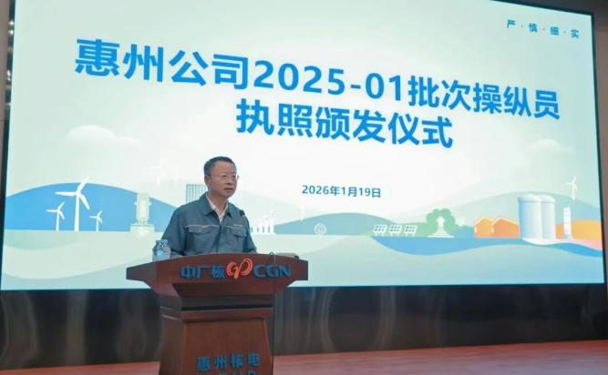 2026年1月19日晚,惠州核電惠聚英才2025年度結業總結會暨2025-01批次操縱員執照頒發儀式在培訓中心113階梯教室舉行。黨委書記、董事長章國強作總結講話,公司領導班子參加活動并出席頒照、頒獎環節,活動由培訓部經理邢衛東主持。操縱員執照頒發儀式作為會議第一項議程,由公司黨委委員,副總經理陳吉勝為2025-01批次新晉操縱員頒發執照。隨后,章國強寄語新晉操縱員肩負守護核安全的神圣使命,并提出四點期望:一 將核安全高于一切融入每一次操作...