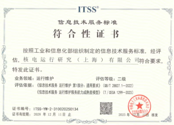 核電運行研究院通過信息技術運維服務成熟度二級認證