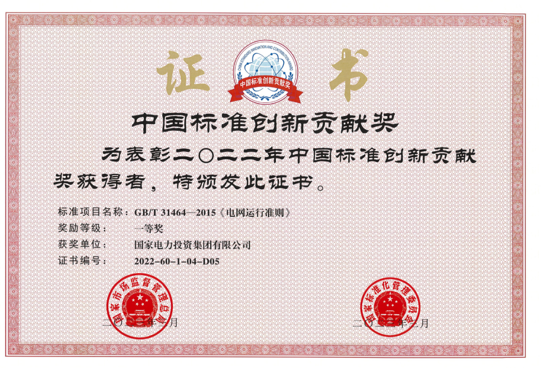 近日,國家市場監督管理總局、國家標準化管理委員會聯合發布了《關于2022年度中國標準創新貢獻獎授獎的決定》,對在經濟社會發展中發揮重要作用的標準項目和在國際國內標準化工作中作出顯著成績的單位和個人進行表彰。國家電投作為主要完成單位之一編制的GB/T 31464—2015《電網運行準則》,在眾多參加評獎的國際標準、國家標準、行業標準項目中脫穎而出,榮獲國家標準化領域最高獎項“中國標準創新貢獻獎”一等獎。