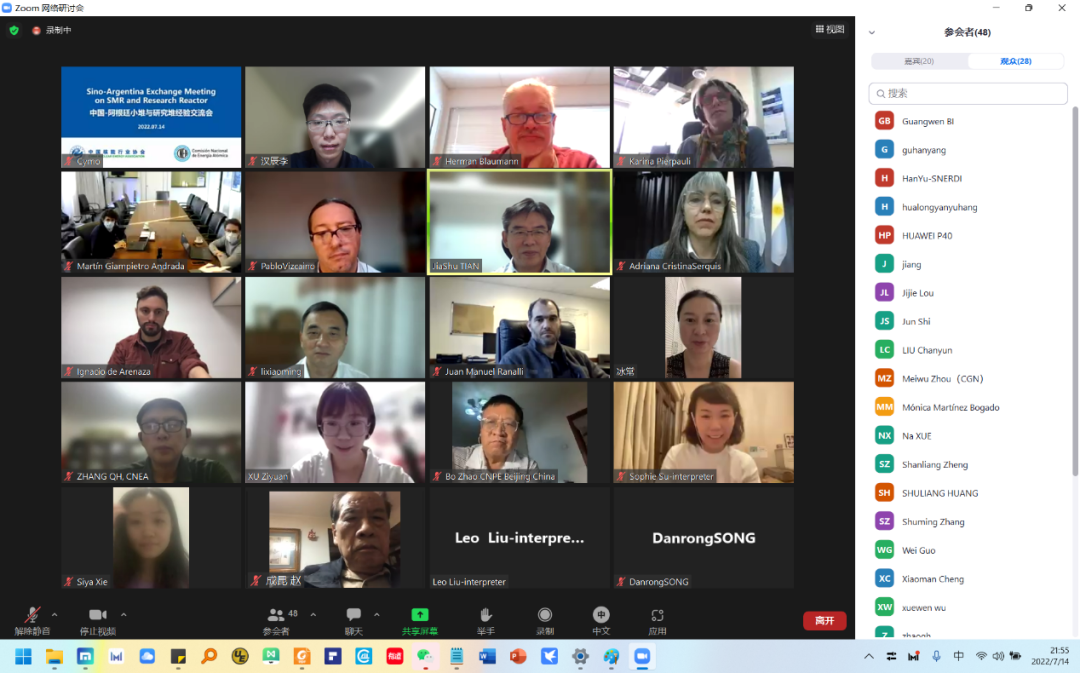 2022年7月14日,中國(guó)核能行業(yè)協(xié)會(huì)與阿根廷原子能委員會(huì)以視頻方式召開了中國(guó)-阿根廷小堆與研究堆經(jīng)驗(yàn)交流會(huì),來自中阿雙方機(jī)構(gòu)的81名專家參加了會(huì)議。協(xié)會(huì)先進(jìn)核能專委會(huì)主任李曉明和阿根廷原委會(huì)主席阿德里安娜·塞爾奎斯女士出席會(huì)議并致辭。會(huì)議由協(xié)會(huì)先進(jìn)核能專委會(huì)副主任田佳樹主持。