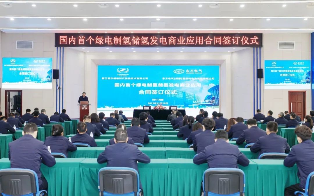 11月28日,國內首個且容量功率最大的綠電制氫儲氫發電商業應用項目簽約儀式在東方電氣集團旗下東方鍋爐舉行。