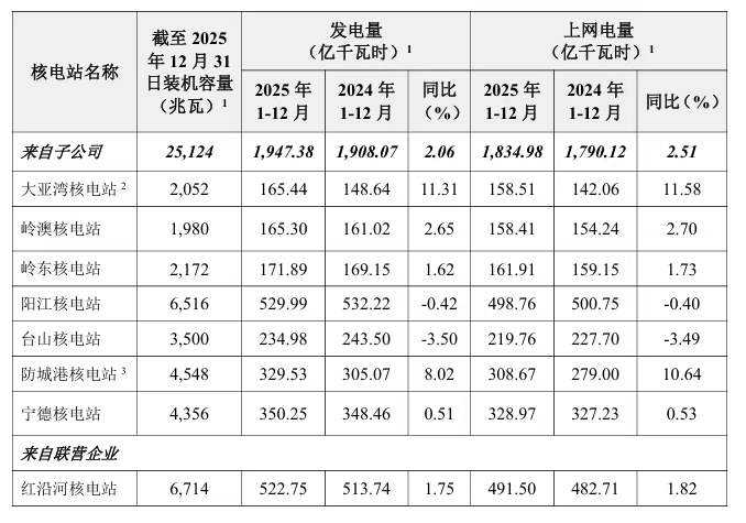 2025年1月至12月份,中國廣核及其子公司(以下簡稱本集團)運營管理的核電機組總發(fā)電量約為2,470.13億千瓦時,較去年同期增長2.00%。總上網(wǎng)電量約為2,326.48億千瓦時,較去年同期增長2.36%。2025年1月至12月份發(fā)電量及上網(wǎng)電量詳情如下:公告披露2025年第四季度的運營情況,在運機組方面,2025年第四季度,本集團按計劃完成了4個年度換料大修。截至2025年12月31日,本集團已按計劃完成16個年度換料大修(其中包括1個跨年年度換料大修)、2個十年大修和1...