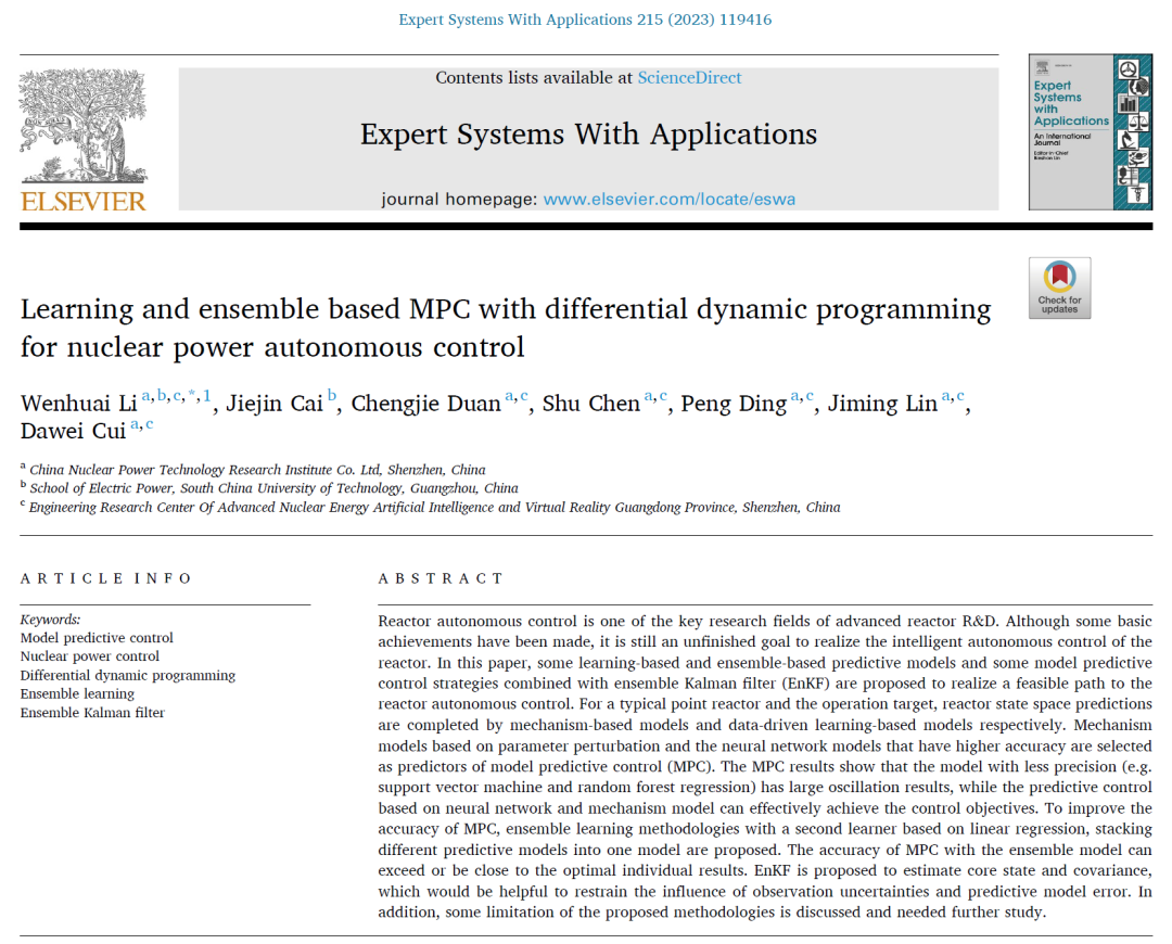 近日,以中廣核研究院有限公司為第一作者單位,題為《基于集成學(xué)習(xí)及微分動(dòng)態(tài)規(guī)劃模型預(yù)測控制的核反應(yīng)堆功率自主控制》(Learning and Ensemble based MPC with Differential Dynamic Programming for Nuclear Power Autonomous Control)的最新研究成果在人工智能領(lǐng)域國際核心期刊《專家系統(tǒng)與應(yīng)用》(Expert Systems With Applications)上發(fā)表。