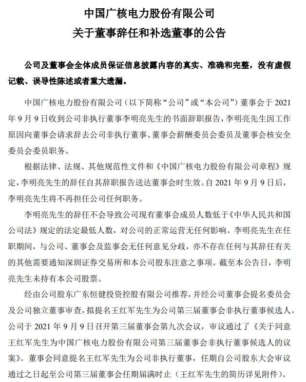 據(jù)公開消息顯示,2021年9月9日,中國廣核董事會收到非執(zhí)行董事李明亮先生的書面辭職報(bào)告,李明亮先生因工作原因辭去中國廣核非執(zhí)行董事、董事會薪酬委員會委員及董事會核安全委員會委員職務(wù)。