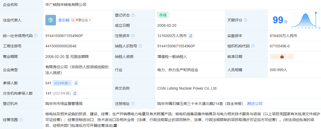 中廣核陸豐核電有限公司增資至121.65億元