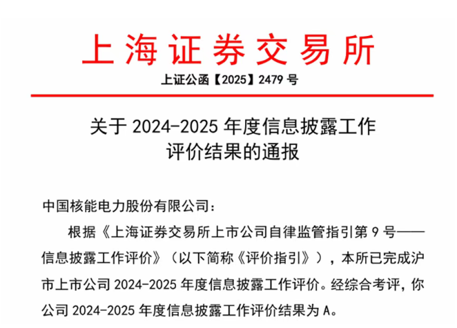 近日,中國核電收到上海證券交易所(以下簡稱上交所)函告,在上交所滬市上市公司2024至2025年度信息披露工作評價中,中國核電連續第4年獲得最高等級A級評級(優秀), 這也是中國核電公司自2015年上市以來第9次榮獲A級評級,充分彰顯了上交所對中國核電在規范治理、信披質量、投資者關系維護等方面工作的高度肯定。據了解,2024-2025年度參評滬市上市公司超2000家,其中獲得A級評級的公司占比僅19%。上交所信息披露工作評價范圍不僅限于上市公司的信...