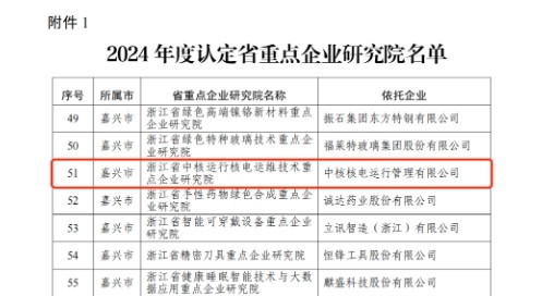 近日,浙江省經濟和信息化廳公布了2024年度認定的省級企業研發機構名單,其中公司申報的“浙江省中核運行核電運維技術重點企業研究院”成功通過省重點企業研究院認定。
