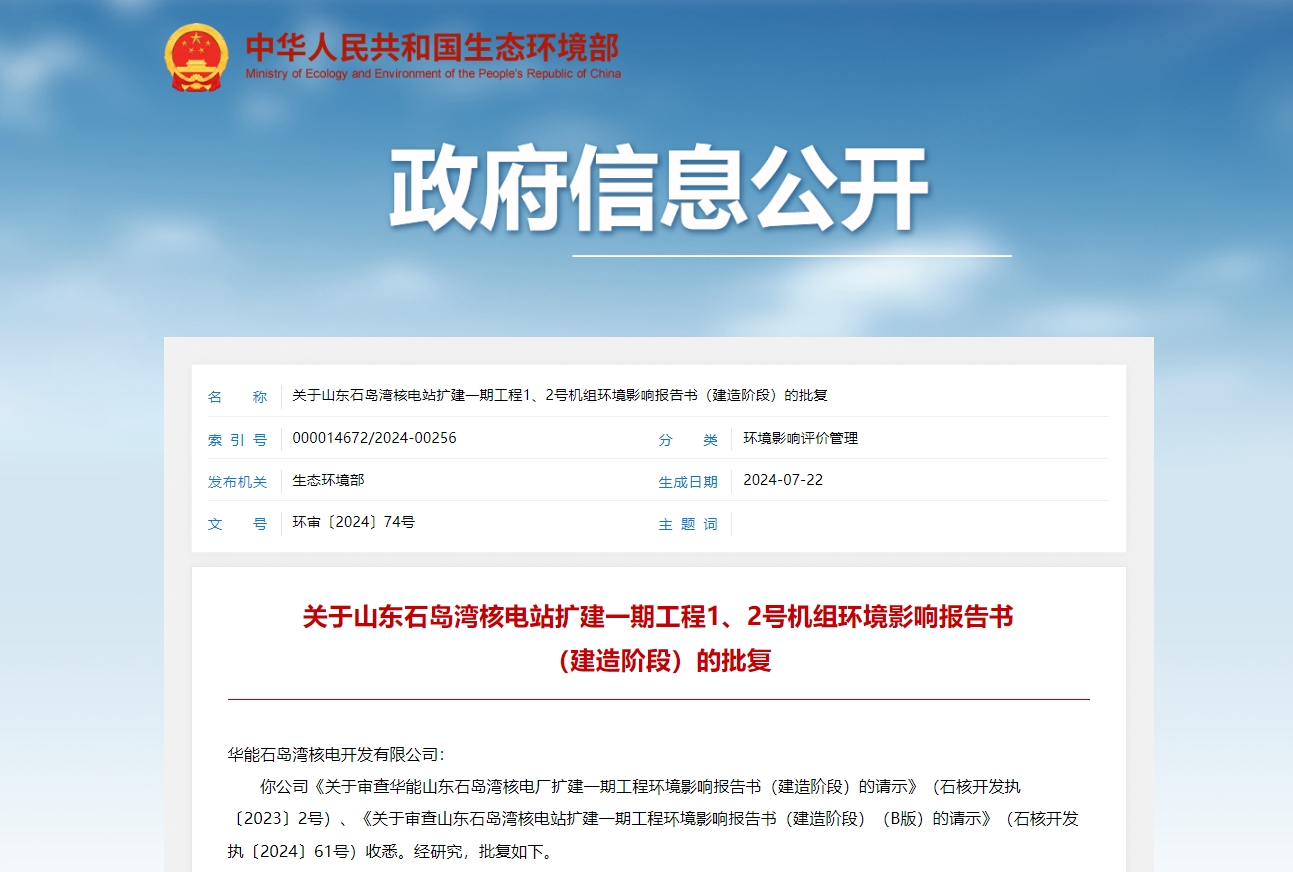 近日,生態環境部發布關于山東石島灣核電站擴建一期工程1、2號機組環境影響報告書(建造階段)的批復。山東石島灣核電站擴建一期工程1、2號機組位于山東省威海市榮成市寧津鎮,規劃建設兩臺百萬千瓦級華龍一號核電機組及配套設施。