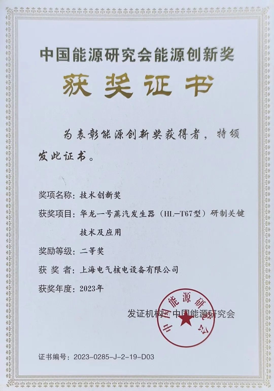 近日,2023年度中國能源研究會能源創新獎正式發布,上海電氣核電設備有限公司(以下簡稱“上核公司”)與中廣核工程有限公司(以下簡稱“中廣核工程”)聯合攻關的“‘華龍一號’蒸汽發生器(HL-T67型)研制關鍵技術及應用”項目榮獲中國能源研究會能源創新獎技術創新獎二等獎。