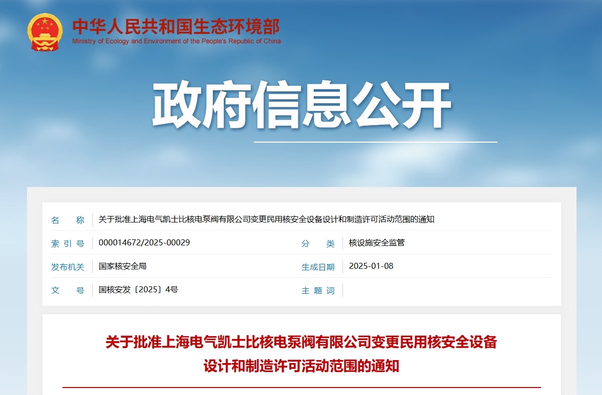 關于批準上海電氣凱士比核電泵閥有限公司變更民用核安全設備設計和制造許可活動范圍的通知