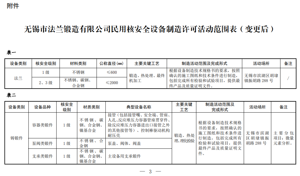 國家核安全局批準無錫市法蘭鍛造有限公司許可證變更申請