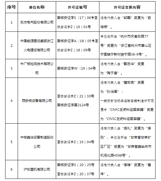 國家核安全局同意東方電氣等6家民用核安全設備許可證信息變更