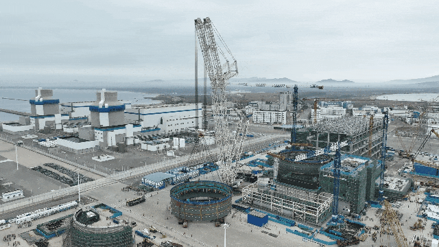 2024年3月16日9時16分,海陽核電3號機組核島鋼制安全殼筒體三環模塊順利吊裝就位。