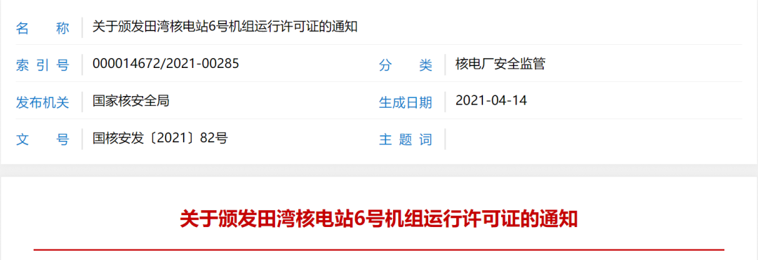 根據(jù)《中華人民共和國核安全法》《中華人民共和國民用核設(shè)施安全監(jiān)督管理條例》的有關(guān)要求,我局對你公司提交的田灣核電站6號機(jī)組運行許可證申請書及相關(guān)文件進(jìn)行了審查,認(rèn)為該申請是可以接受的,決定頒發(fā)田灣核電站6號機(jī)組運行許可證。
