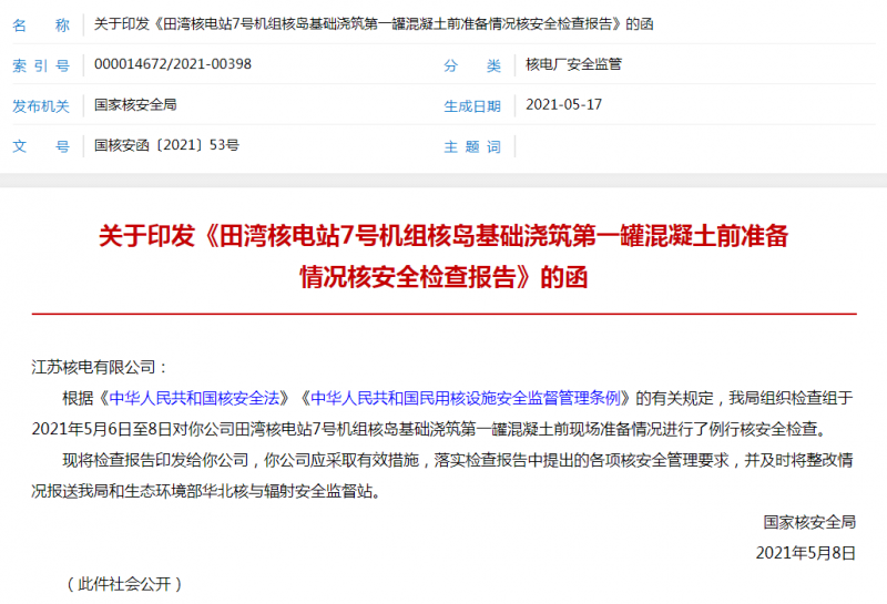 根據(jù)《中華人民共和國核安全法》《中華人民共和國民用核設(shè)施安全監(jiān)督管理條例》的有關(guān)規(guī)定,我局組織檢查組于2021年5月6日至8日對你公司田灣核電站7號機(jī)組核島基礎(chǔ)澆筑第一罐混凝土前現(xiàn)場準(zhǔn)備情況進(jìn)行了例行核安全檢查。