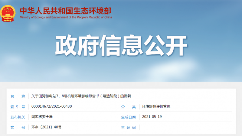 5月19日,國家核安全局發(fā)布《關(guān)于頒發(fā)田灣核電站7、8號機(jī)組建造許可證的通知》,國家核安全局通過組織檢查組對田灣核電站7號機(jī)組核島現(xiàn)場準(zhǔn)備情況進(jìn)行監(jiān)督檢查,認(rèn)為該機(jī)組現(xiàn)場各項準(zhǔn)備工作已具備核島基礎(chǔ)澆筑第一罐混凝土的基本條件。