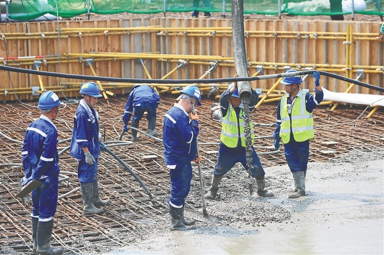 6月3日上午,如火的烈日炙烤著大地,在海南昌江核電二期工程項目建設工地,施工人員冒著酷暑在各自的工作面作業,在3號機組外圍,幾臺混凝土泵車伸著長長的鐵臂輸送混凝土澆筑3號機組的核島。“整個項目共投入40多臺設備和1700名工人同時施工。”華能海南昌江核電有限公司工程管理部主任王海波告訴海南日報記者。
