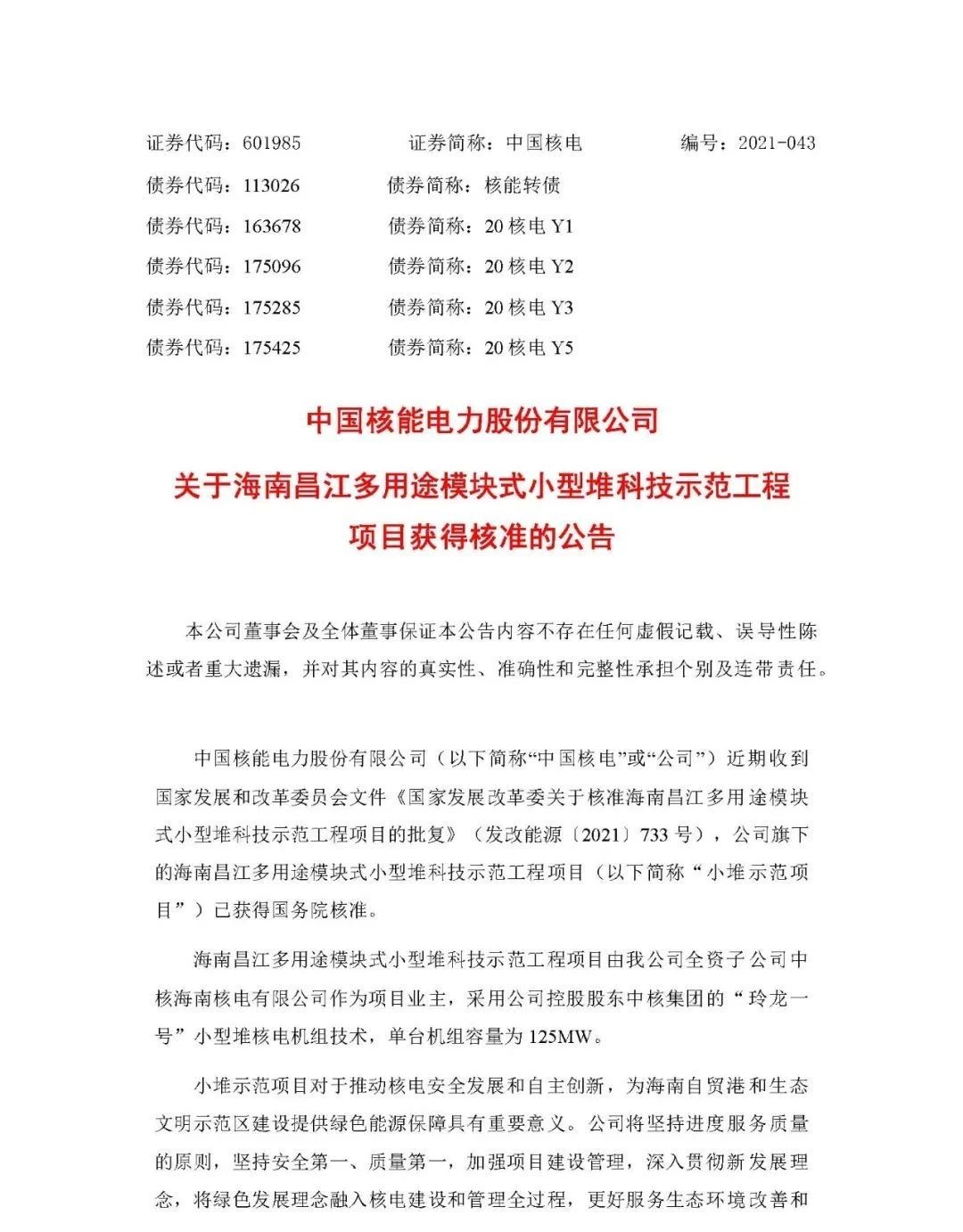 6月3日,中國核能電力股份有限公司發布上市公告。公告中指出,中國核電近期收到國家發展和改革委員會文件《國家發展改革委關于核準海南昌江多用途模塊式小型堆科技示范工程項目的批復》(發改能源〔2021〕733 號),該公司旗下的海南昌江多用途模塊式小型堆科技示范工程項目(小堆示范項目)已獲得國務院核準。