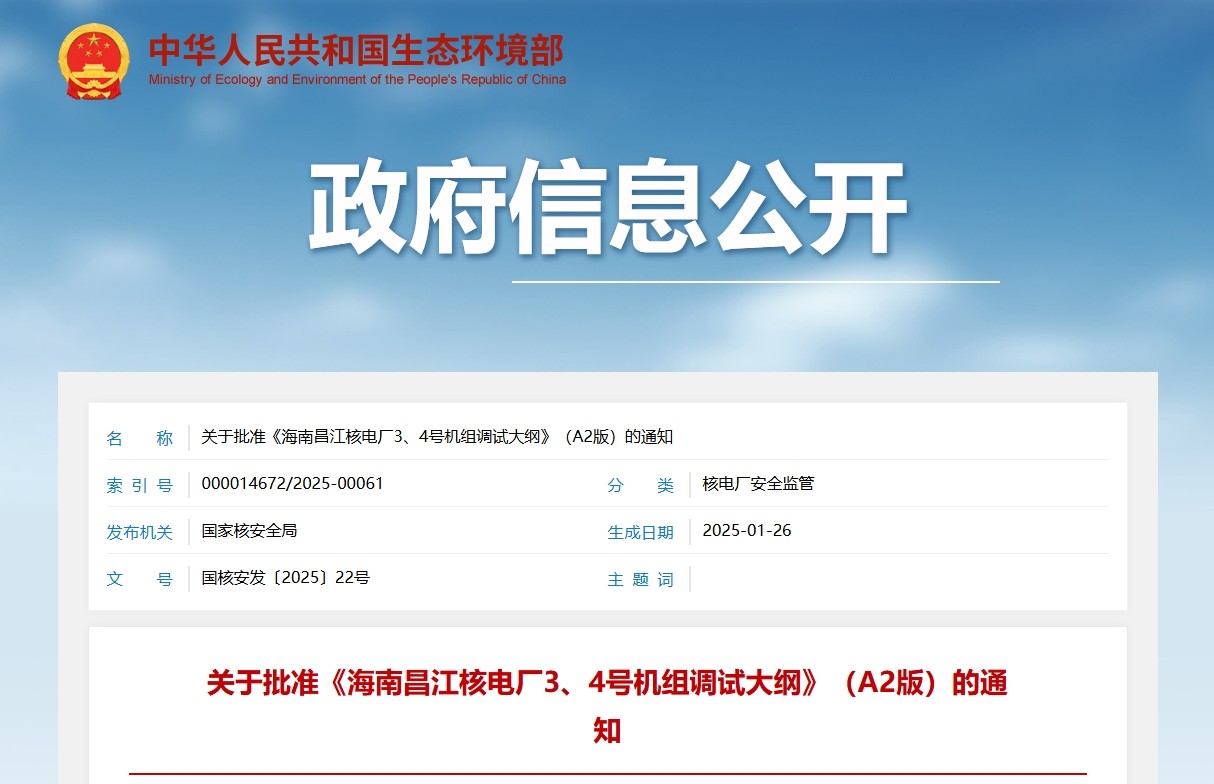 關(guān)于批準(zhǔn)《海南昌江核電廠3、4號機(jī)組調(diào)試大綱》(A2版)的通知