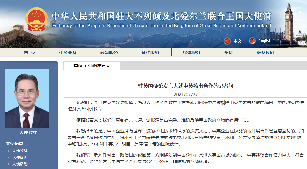 駐英國使館發言人就中英核電合作答記者問