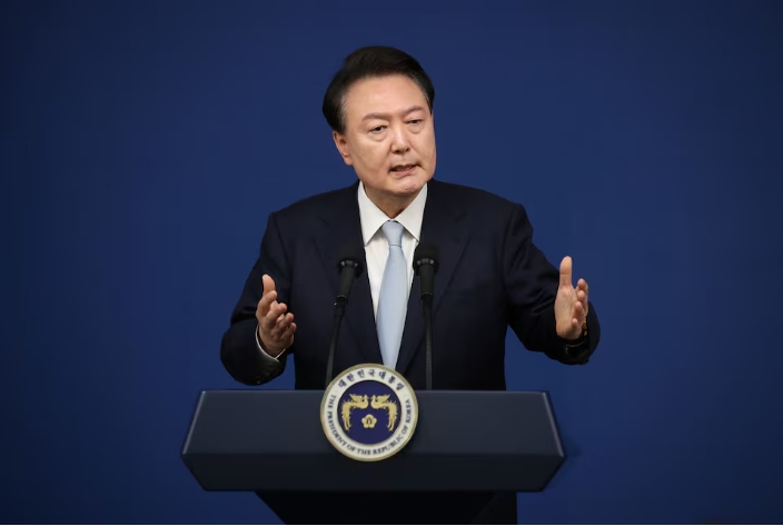 2024 年 8 月 29 日,韓國總統尹錫烈在首爾總統府舉行的新聞發布會上就國事發表講話。