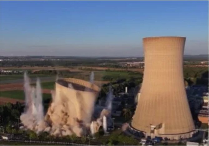 德國南部巴伐利亞州原格拉芬萊茵費(fèi)爾德核電站的兩座 143 米高的冷卻塔在拆除過程中被炸毀,產(chǎn)生 55,000 噸混凝土和鋼鐵碎片。拆除過程僅用了 30 秒。