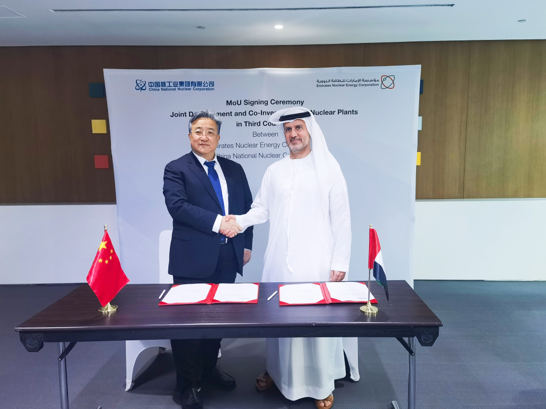 為進一步推動核能國際合作,促進核能在應對氣候變化中發揮更大作用,11月30日至12月1日第28屆聯合國氣候變化大會(COP28)期間,中核集團董事長余劍鋒率團出訪阿聯酋,與阿聯酋核能公司董事總經理兼總裁哈馬迪舉行會談,雙方簽署了第三國核能聯合開發與投資的諒解備忘錄。