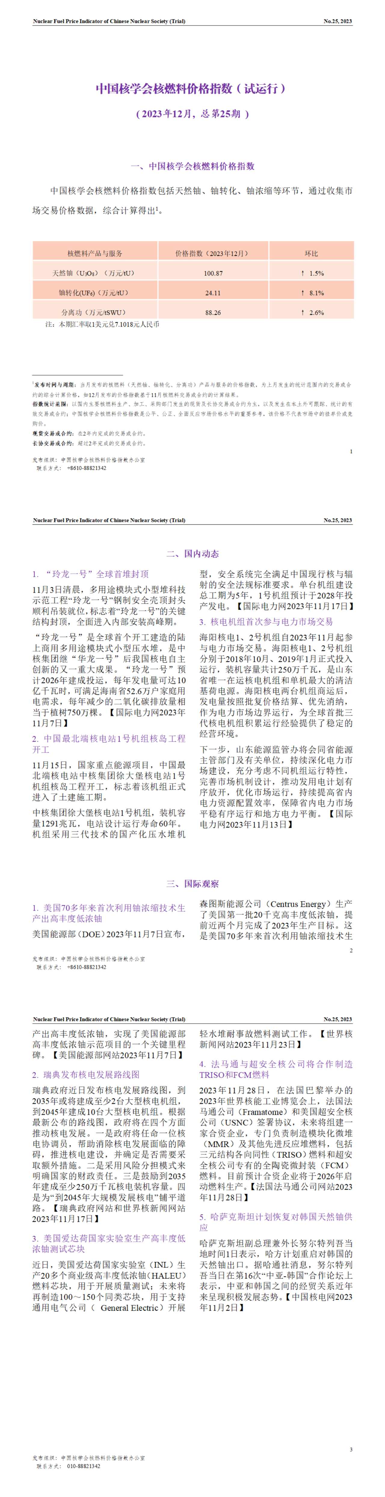 2023年12月11日,中國核能行業協會發布第37期“CNEA國際天然鈾價格預測指數(2023年12月)”。