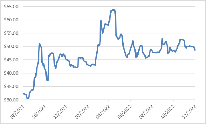 臨近年終,買方采購意愿持續減弱。本周五是TT月末定價日,一家日本貿易商持續報出低價,最終在48美元/磅成交20萬磅,本周現貨市場收盤48美元/磅。