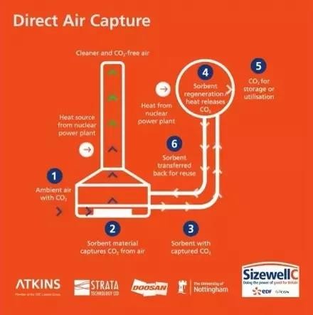 英國塞茲韋爾核電站(Sizewell C)公司與諾丁漢大學、Strata Technology、Atkins和Doosan Babcock等公司的頂尖工程師和碳捕獲專家合作,研發由核電站提供動力直接空氣捕獲(Direct Air Capture ,DAC)示范項目,獲得了政府“凈零創新投資計劃”的資助。